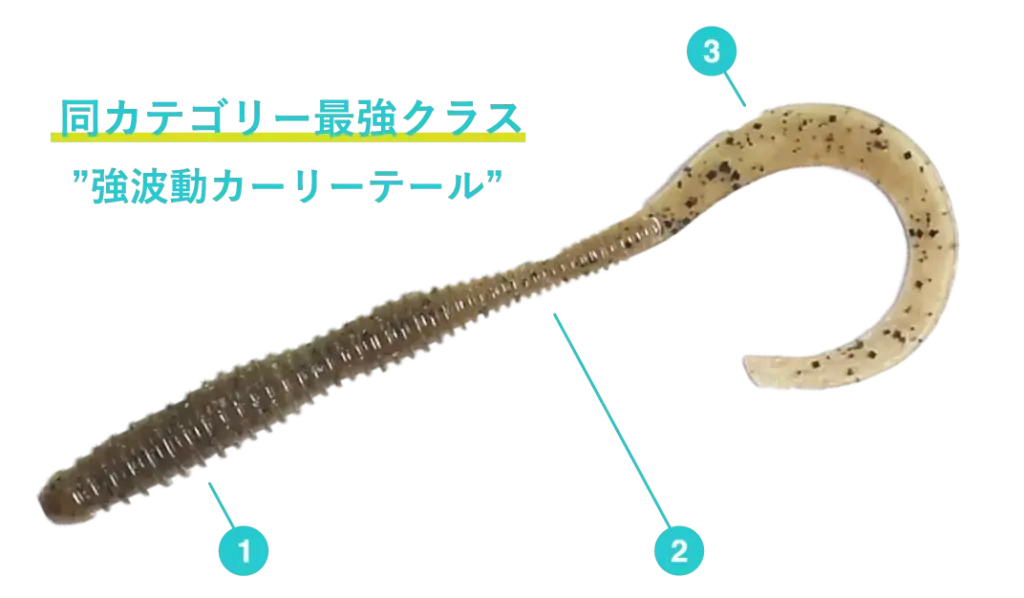 全長に対して長め+肉厚な設計のテールで水を”ギュルギュル” とかき回す。4インチサイズのカーリーテイルでは最強クラスの水押を実現。